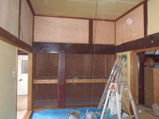 | リフォーム状況 ・床断熱化完了 ・壁土壁にベニヤ張完了 ・天井も断熱材を入れボード張完了 ・正面の押入クローゼットに改修 |