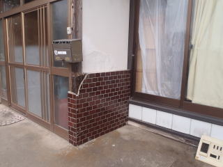 | 着工前 ・地震でタイルが割れて危ないとのことで 玄関両側タイルからサイディングに変更 を提案しました。 |