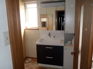 洗面化粧台 ・老朽化のため交換(脇のキャビネットは既存) ・LIXILのピエラを提案 ・洗面部分の底が深くバケツも入れられる ため使いやすいと評判の商品です。 ・扉は広く使える引出式を採用しました。 |
