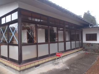 | 着 工 前(外観) ・木製サッシから隙間風及び劣化が著しい ・地震のたびにガラスが外れそうになる。 |