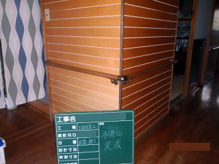完 成(階段) ・下地位置が手摺金具取付位置より遠いため、新しく手摺受け木材を設置しその上に手摺を取り付けました。 |