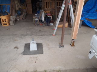 | ハカマ石設置(下屋独立柱) ・羽子板付きハカマ石を15cm埋め込んで、その下にコンクリートを15cm打設して、後置きでなく、同時施工で行いました。 |